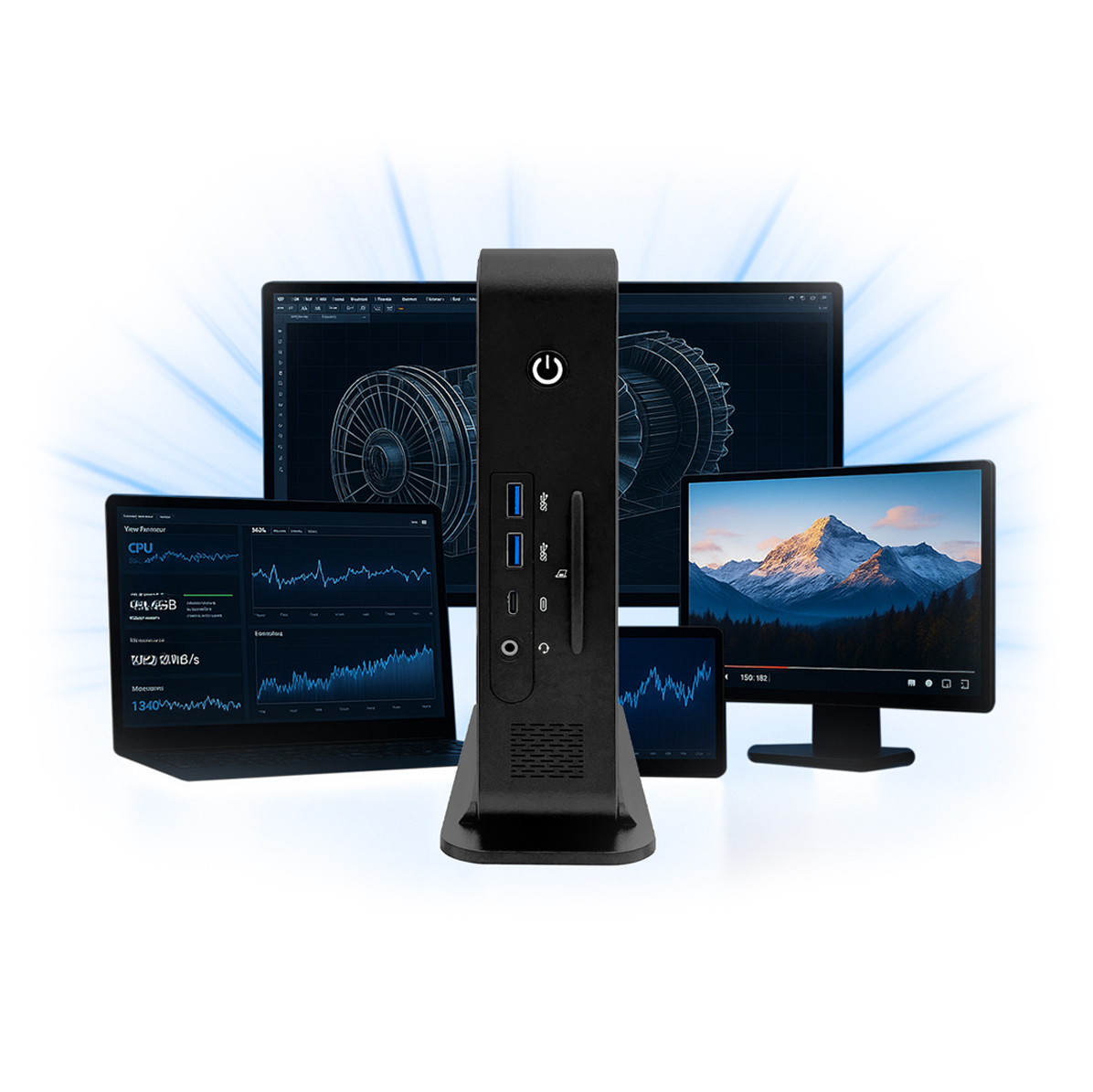 The new model BLACK.QUADRO.II continues the success story of our BLACK.QUADRO and now offers even more performance, flexibility, and future-proofing – all in the same compact design. Equipped with an AMD® R-Series Quad-Core processor and integrated Radeon™ Vega GPU, it delivers impressive computing power for demanding work environments. Thanks to its fanless design, the device operates silently and with low maintenance.